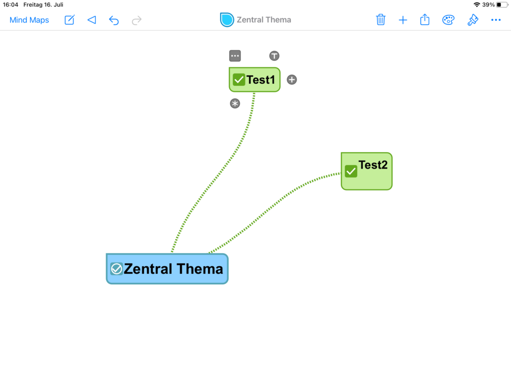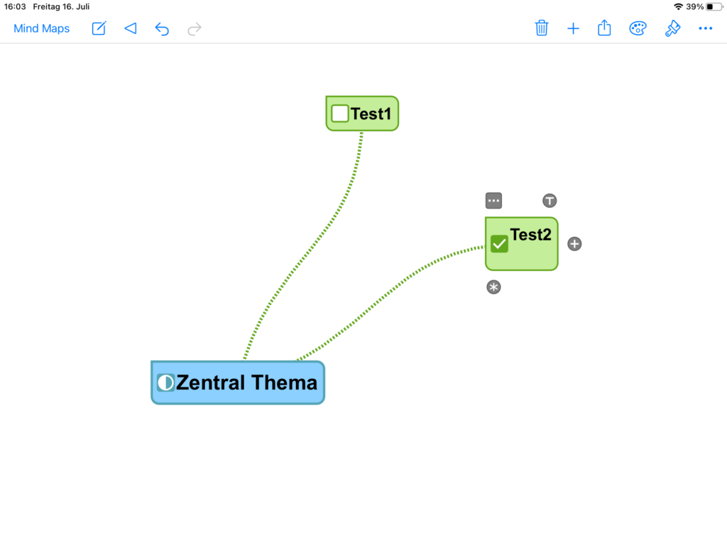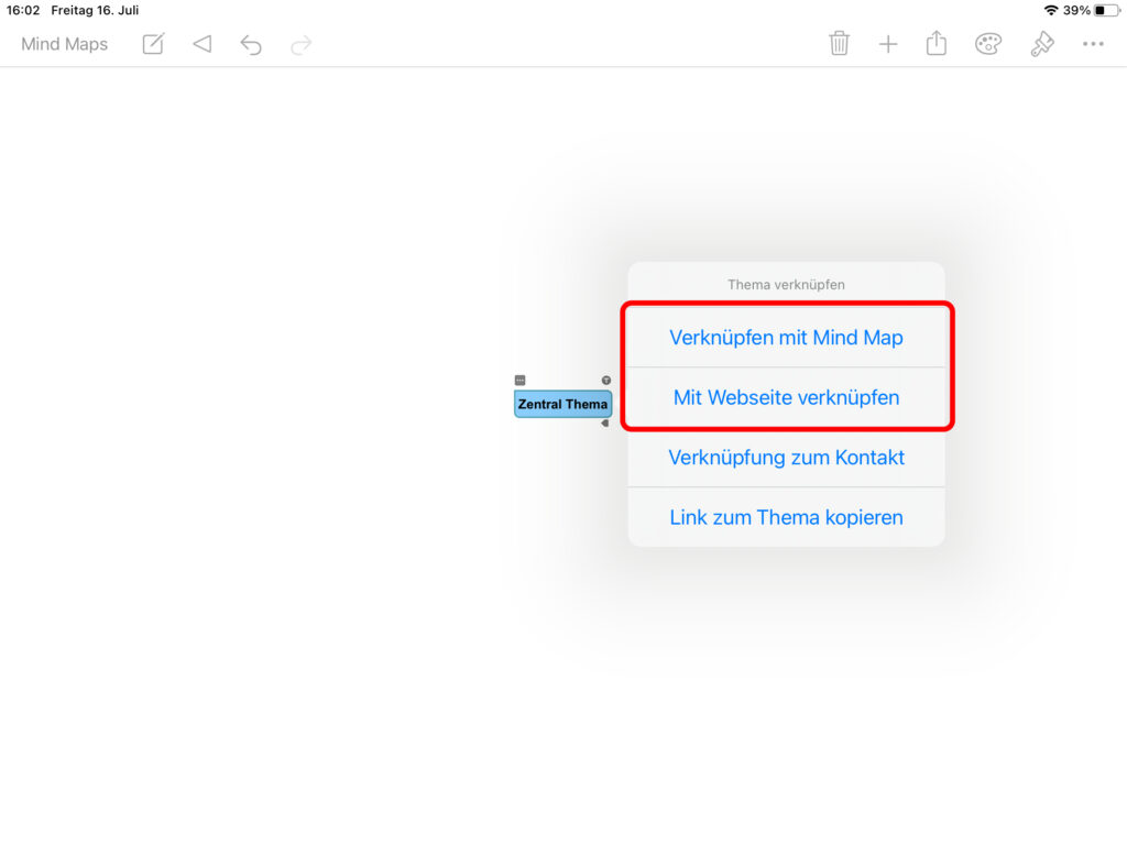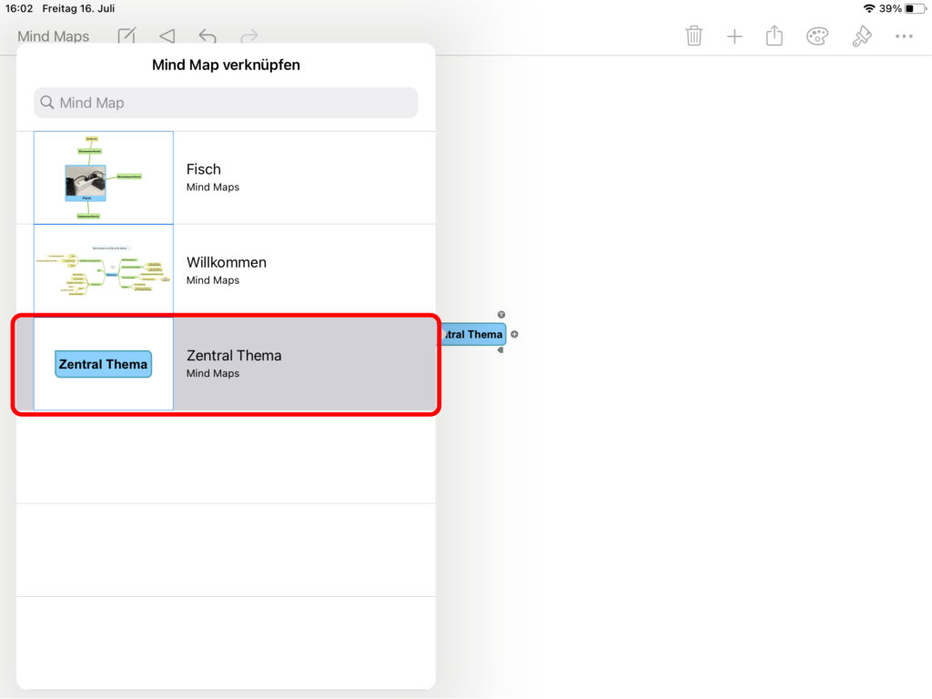 Über einen Klick auf «Verknüpfen mit Mindmap» kannst du ein anderes Mindmap verlinken. Wenn du dieses Feld anklickst, erscheint automatisch eine Auswahl aller Mindmaps, die du bereits erstellt hast. Um eines auszuwählen, kannst du es ganz einfach antippen.