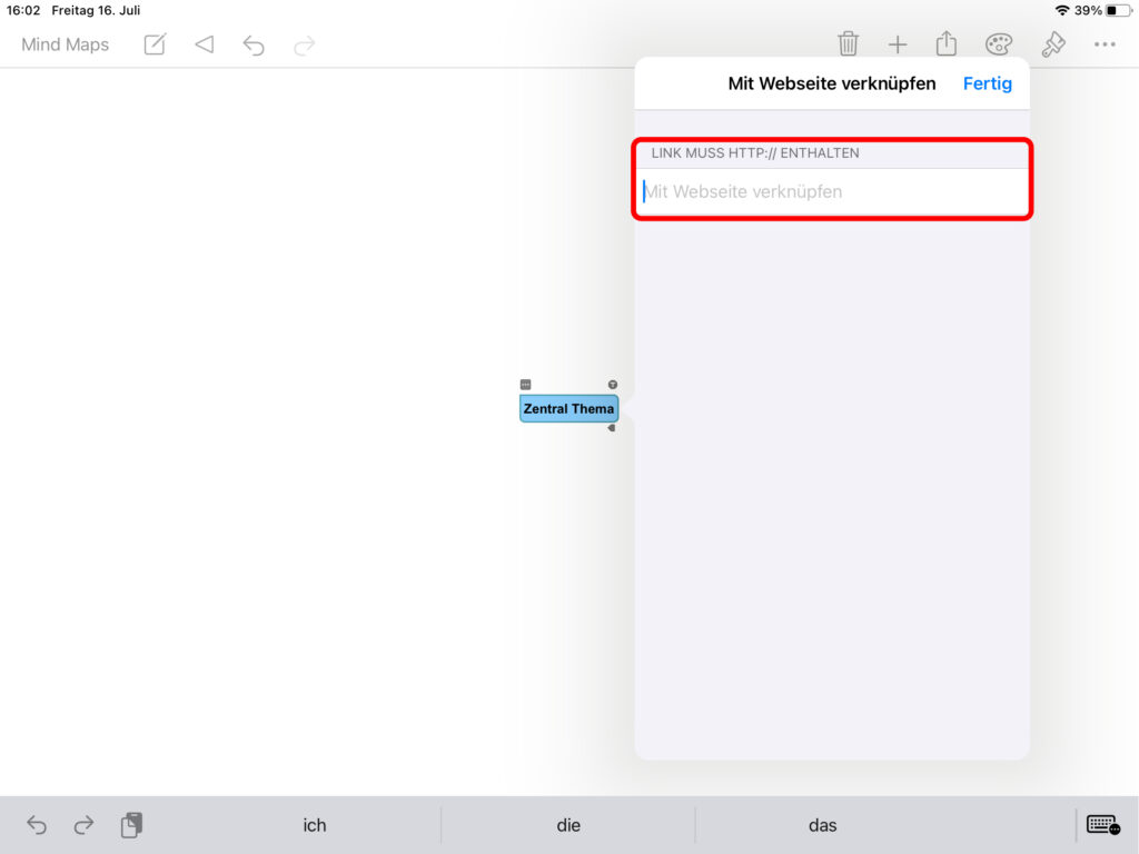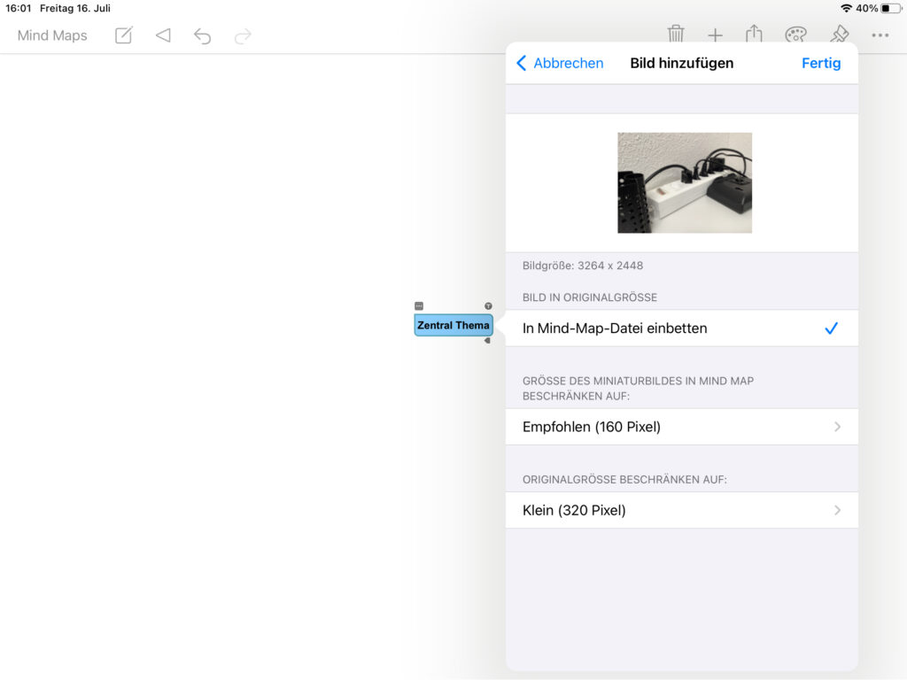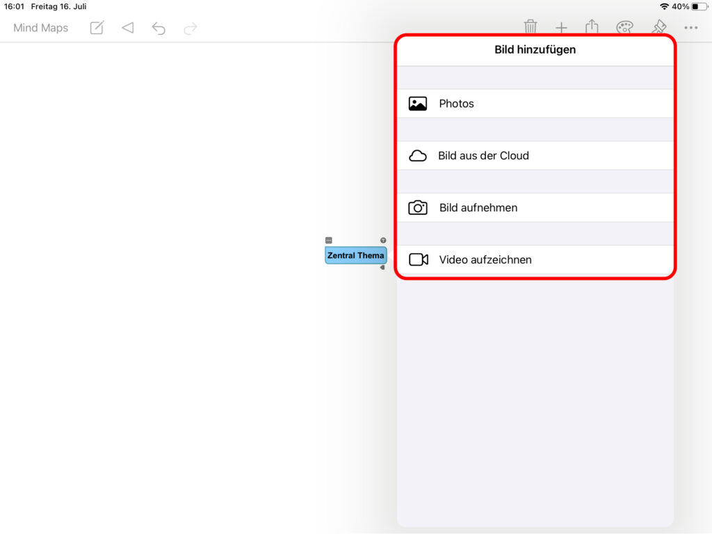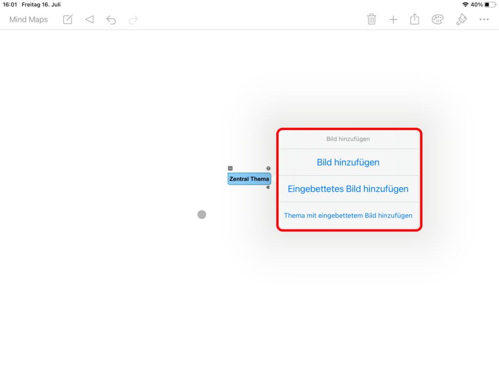 Über einen Klick auf «Verknüpfen mit Mindmap» kannst du ein anderes Mindmap verlinken. Wenn du dieses Feld anklickst, erscheint automatisch eine Auswahl aller Mindmaps, die du bereits erstellt hast. Um eines auszuwählen, kannst du es ganz einfach antippen.