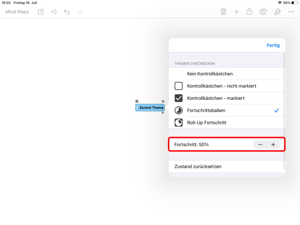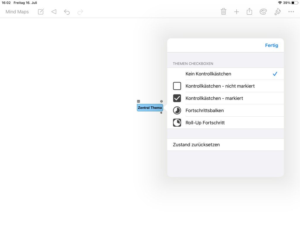 Du hast die Möglichkeit, in deinem Mindmap Checkboxen einzufügen. Klicke dazu auf das Feld mit dem Häklein. Es stehen dir fünf verschiedene Möglichkeiten zur Auswahl.