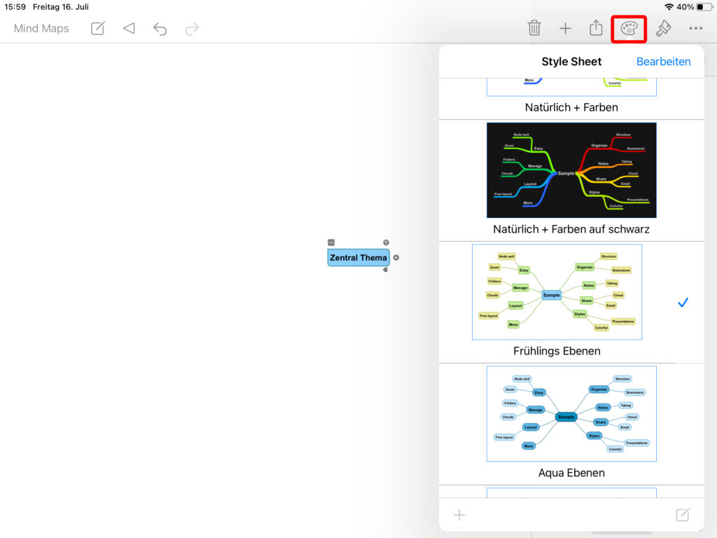 Du beginnst mit der Arbeit an deinem Mind Map, indem du das Hauptthema definierst. Du kannst auch das Layout des leeren Mindmaps anpassen, indem du in der Taskleiste auf das Symbol mit der Palette klickst und den Stil auswählst, der dir gefällt.