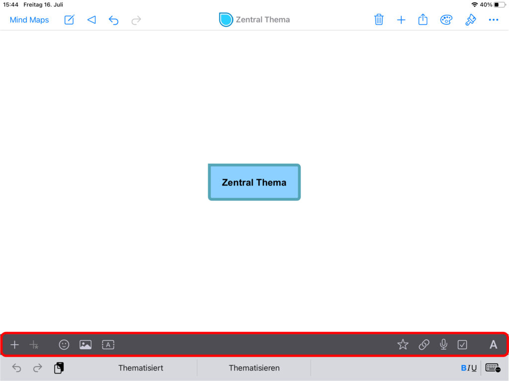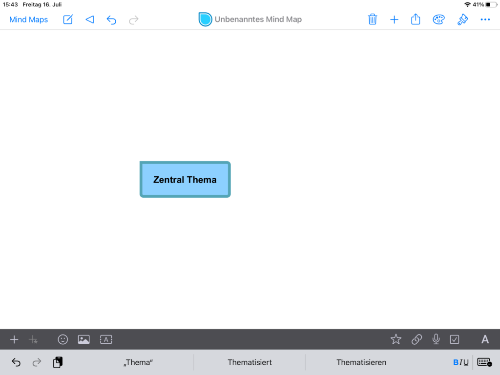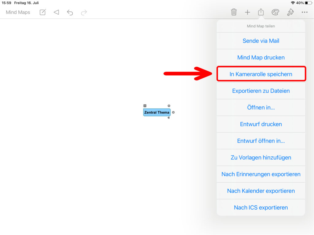 Während der Arbeit am Mindmap musst du dieses nicht eigenhändig abspeichern, da das vom Programm automatisch übernommen wird. Du kannst, wenn du das möchtest, dein fertiges Mindmap jedoch als Bild exportieren. Dazu klickst du in der Leiste oben rechts auf das «Teilen-Symbol» und anschliessend auf «In Kamerarolle speichern». Somit wird das Mindmap als Bild in deiner Fotomediathek abgespeichert.