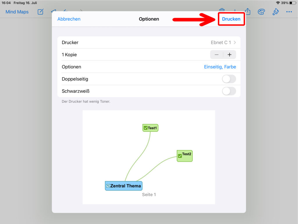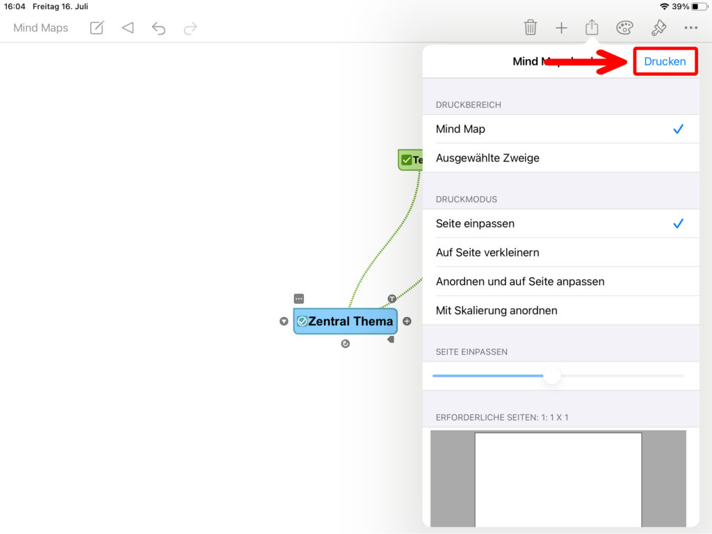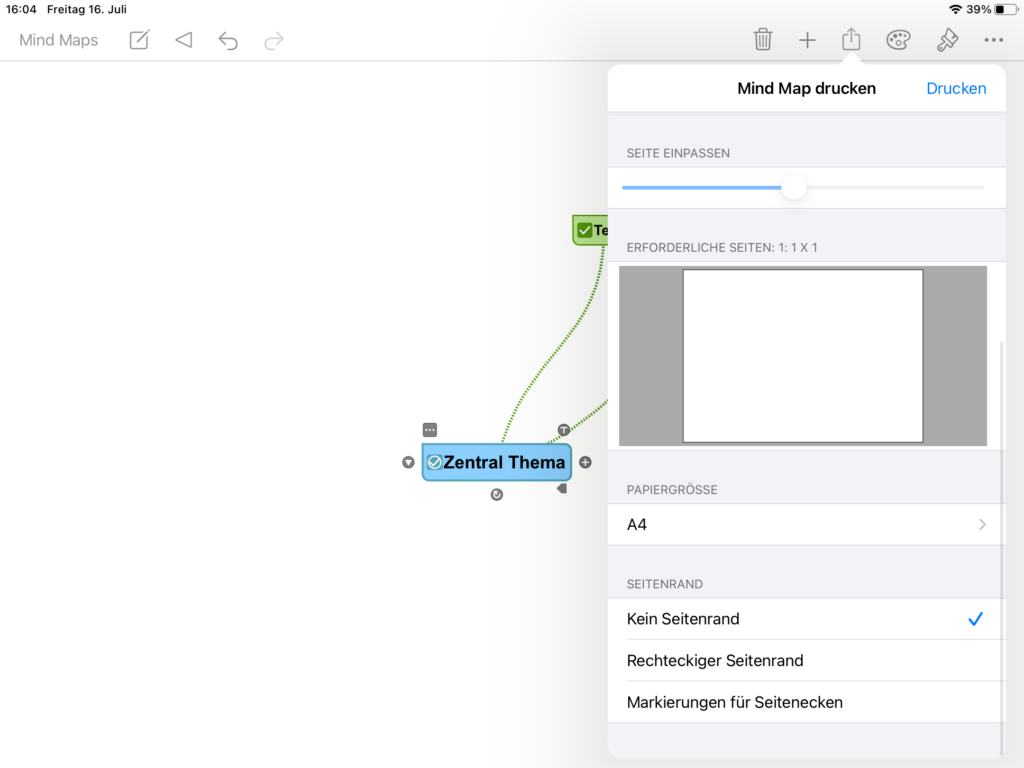 Du kannst dein Mindmap auch ausdrucken. Klicke dazu auf das «Teilen-Symbol» und wähle «Mindmap drucken» aus. Nun erscheint das Druckfenster. Hier kannst du den Druckbereich und den Druckmodus anpassen. Auch die Papiergrösse und die Seitenrandeinstellungen kannst du hier anpassen. Beachte aber, dass die Standardeinstellungen meist richtig sind. Wenn du mit deinen Anpassungen fertig bist, klickst du oben rechts auf «Drucken». Es erscheint ein neues Fenster, in welchem du den passenden Drucker auswählst, angibst wie viele Kopien erstellt werden sollen und ob es doppelseitig ausgedruckt werden soll. Sprich dich mit deiner Lehrperson ab, bevor du dein Mindmap farbig ausdruckst. Klicke anschliessend auf «Drucken», um dein Mindmap auszudrucken.