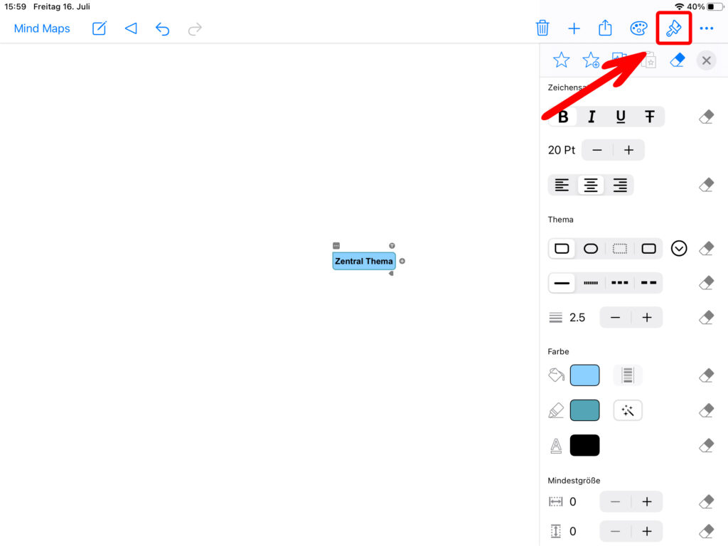 Weitere Bearbeitungsoptionen stehen dir zur Verfügung, wenn du ein Feld auswählst und danach auf das Symbol mit dem Pinsel klickst. Es erscheint auf der rechten Seite ein Auswahlfenster mit unzähligen Optionen zur Bearbeitung des Mindmaps. Vom Verändern des Textes bis zum Verändern der Formen findest du hier viele verschiedene Möglichkeiten, wie du dein Mindmap individuell gestalten kannst.