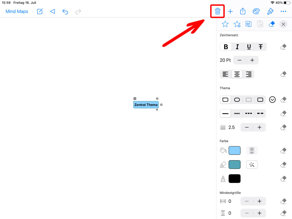 Mit einem Klick auf das Mülleimer-Symbol in der Taskleiste, kannst du ein zuvor ausgewähltes Feld wieder löschen. Wenn du ein Textfeld mit einem Doppelklick öffnest, erscheint eine neue Leiste mit verschiedenen Optionen.