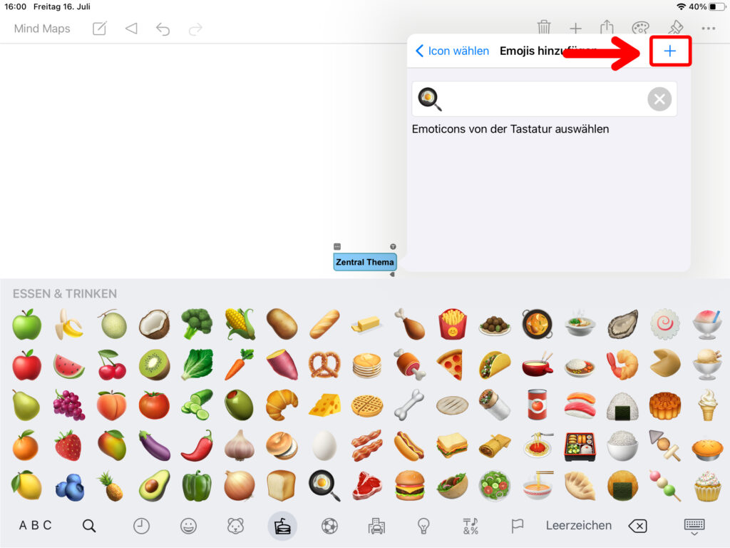 Wenn du in der Leiste auf das Symbol mit dem Smiley klickst, dann kannst du Icons und Emojis zu deinem Mindmap hinzufügen. Es öffnet sich ein Auswahlfenster. Im ersten Auswahlfeld findest du vordefinierte Icons. Im zweiten Auswahlfeld sind die Emojis zu finden. Am Anfang wird nur eine sehr kleine Auswahl an Emojis angezeigt, was du aber problemlos ändern kannst. Dazu klickst du auf «Bearbeiten» und anschliessend auf das Pluszeichen. Hier kannst du nun nach beliebigen Emojis suchen und über ein erneutes Klicken auf das Pluszeichen deiner Auswahl hinzufügen.